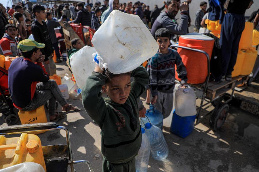 People wait to fetch water in the southern Gaza Strip city of Rafah, on March 22, 2024. [Photo/Xinhua]