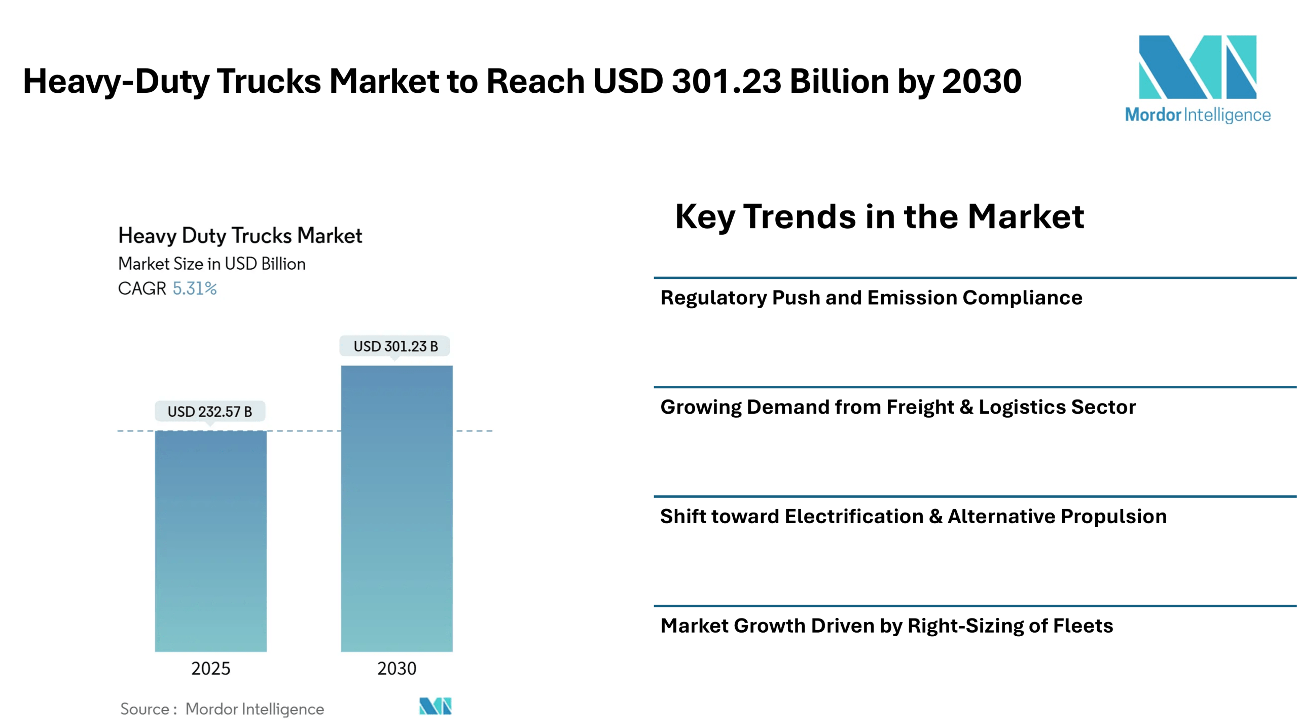 The heavy duty trucks market is valued at USD 232.57 billion in 2025 and is forecast to reach USD 301.23 billion by 2030, registering a 5.31% CAGR.  As the demand for freight transport, logistics, and construction infrastructure continues to rise worldwide, the heavy duty trucks market is experiencing growth rooted in evolving buyer preferences, shifting regulations on emissions, and emerging powertrain technologies. In parallel, fleet owners are balancing legacy diesel platforms against nascent electric and zero-emission alternatives  a development that is shaping long-term capital-allocation and procurement plans across regions.