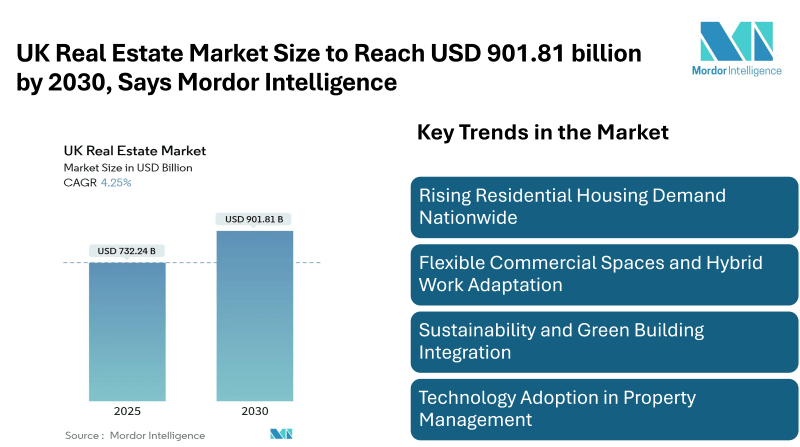 According to Mordor Intelligence, the UK Real Estate Market size is estimated at USD 732.24 billion in 2025 and is expected to reach USD 901.81 billion by 2030, at a CAGR of 4.25%. The outlook for the UK real estate market share reflects continued expansion in urban hubs while supporting regional development projects, positioning the sector as a key contributor to the overall real estate landscape in the UK.